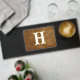 Rich brown leather textured background with personal monogram in white with gold edge.