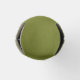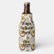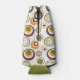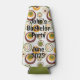 This bottle cooler has a mid-century modern design of concentric circles in green, orange, and brown on a white background.