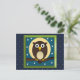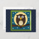 Brown night owl sitting on a branch. Behind him is a big yellow moon and a starry night. Framed in a green frame.