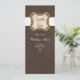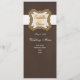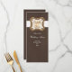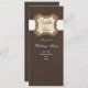 Brown, yellow, and orange leopard print Wedding Menu Card with white accents and photo of brown paper with 3D textured look as a background printed on plain white paper. A bold fun African safari themed wedding menu card. Design by Elke Clarke © Graphics licensed. Animal print.