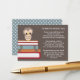 A cute little blue owl perches atop a stack of red, blue and tan books on a soft mocha brown background in this fun storybook request wishing well card. A charming poem requests that guests bring a book for the baby-to-be to start the new mom off with a library of beloved children's books. Just insert this sweet card inside the baby shower envelope, and your guests will know what's needed to start baby on the path towards reading.