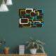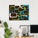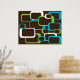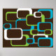 A colorful design of lime green, white turquoise blue retro squares against a chocolate brown background on poster