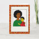 This greeting card shows a tender mother-and-child portrait drawn with simple shapes and strong color contrast ❤️. A woman with rich brown skin and a full crown of dark, curly hair holds a child close, and their steady, calm gazes meet the viewer with quiet closeness. She wears a deep green top while the child, shown with bright yellow skin and dark hair, wears a red outfit that pops against her shoulder. The child’s arm rests softly across her chest, and the way their faces sit near each other gives the scene a gentle, affectionate pull. The figures sit inside a white rectangular frame like a cherished photo, centered neatly on the front. Around that frame, the background fills with deep reds and oranges covered in repeating circular flower-like patterns outlined in black 🌼. Any front text appears above the framed image in small black letters, with a second line placed below the frame in matching black. The patterned field looks like layered rings and petal shapes radiating outward behind the white border.
