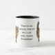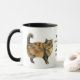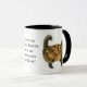 A white coffee mug with a black rim and handle and a longhaired brown tabby cat from a watercolour painting by Judy Adamson front and back. The text, in between the two images, is 'There's no snooze button on a cat who wants breakfast.'