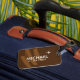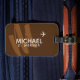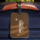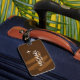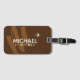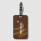 A cool and modern luggage tag personalized with the name and initial of the traveler on a brown background