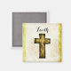 A magnet with a wooden cross illustration in shades of dark brown around the border giving it a burnt look while the rest of the cross is a golden brown with lines and etchings in the wood. Text says have faith. The background is a texture with a faded parchment look in soft white and brown with a fancy golden border.