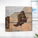 Faux brown wooden paneling and lace that extends from front to back as the background. Two brown cowboy boots with spurs on front with "Our Wedd'n Day" text*. A brown cowboy hat on back with "Sweet Sunset Rides" text*. *Customizable text with templates at right. Spine has brown worn leather look with text also.