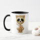 This adorable brown kitten design is decorated with swirls and dot patterns. Yellow flower pedals circle the pure black eyes in the tradition of the Day of the Dead sugar skulls. The cat is sitting down, looking forward with its tail waving in the background. The oversized head sits on a tiny body which creates a playful, cartoon like appearance. A five point star sits in the middle of the kitten’s forehead while a bright red and yellow heart appears in the center of the chest. This cute little cat is a fun and stylish design inspired by the beautiful patterns of Day of the Dead sugar skulls.