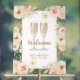 Stylish brunch and bubbly bridal shower clear acrylic Welcome sign features two glasses of bubbly and a beautiful border of garden flowers with your details in chic lettering. MATCHING items in our collection.