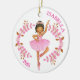 An African-American ballerina twirls in pink with a cute floral headpiece wrapped around a bun. This ornament can be personalized with the name.