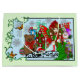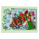 A brunette fairy all in red and green in a blue and green backdrop with snowflakes. All around her are toys, wrapped Christmas presents and symbols of Christmas.
