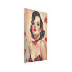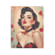 This captivating illustration embodies vintage allure and seductive elegance. The artwork features a stunning brunette with voluminous, short curls styled in a classic pin-up fashion. Her striking golden-brown eyes, dramatic winged eyeliner, and bold red lips exude confidence and sensuality. She wears a black choker adorned with a delicate red rose, enhancing the romantic and slightly edgy aesthetic. Dressed in a glossy black and red strapless gown, she radiates timeless beauty. Surrounding her, blooming red roses add a passionate, dramatic touch, blending seamlessly with the soft, painterly background. This piece is a perfect representation of classic femininity, vintage glamour, and contemporary pin-up art.