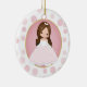 This design features a cute brown haired Princess with pink gown, crown and gloves on a super cute pink dot background.