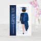 A great way to send your congratulations to the female graduate, featuring blue cap and gown on a young lady with short brunette hair.