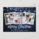 Rustic Blue Wood Brush Script 3 Photo Merry Christmas Card with String Lights