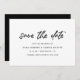 Modern save the date card featuring the words, "save the date" in a brush script handwriting font and three lines of text for your details. The backside is a solid black with one line of text in white for your wedding website or other additional info. The backside may be changed to any color you wish. A simple yet elegant design with a minimalist style.