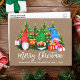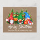 Modern Brush Script Merry Christmas Colorful Fun Watercolor Gnomes Kraft Postcard with Pine Trees and String Lights. Family Name and Year