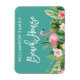 Modern Brush Script, Watercolor Tropical Floral Family Name Beach House Refrigerator Magnet with pink flamingo.