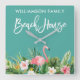 Modern Brush Script, Watercolor Tropical Floral Family Name Beach House Wall Clock with pink flamingo.