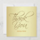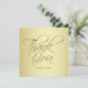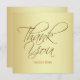Golden Thank You wedding card featuring elegant, looping script letterforms over a brushed gold texture and personalized with the name of the bride and groom.