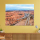 A panoramic view of Bryce Canyon National Park in Utah, showcasing the iconic hoodoos, towering red rock formations that rise from the canyon floor. The image captures a vast expanse of the canyon, with a weathered, bleached-white tree trunk in the foreground, its branches extending towards the viewer. The sky is a soft blue with wispy clouds, adding a sense of tranquility to the scene.