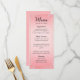 These bubblegum pink wedding menus feature a soft blush gradient background framed by a slim border and delicate white floral accents in each corner, creating a romantic touch at every place setting. The tall, slim layout with elegant script and clean serif fonts beautifully highlights each course, coordinating perfectly with the Bubblegum Blush stationery suite for a cohesive reception look