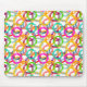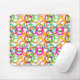 This mouse pad has a geometric design of three circles nested together and spread throughout the design in several colors.