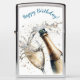 A beautifully illustrated image of a champagne bottle being poured into a crystal glass. The champagne is bubbly and sparkles in the light, with droplets of liquid splashing around, creating an energetic and celebratory atmosphere.