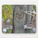Big buck and doe in forest by heart carved on tree trunk with personal names.
