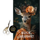 This whimsical design, titled "Buck, Begone!", captures the essence of elegance and humor in a unique fusion of nature and fantasy. The regal deer, adorned with an ornate crown and a stunning rose accent, exudes an air of aristocracy. Dressed in an exquisite, floral-patterned gown with intricate lace details, this noble creature is ready to steal the spotlight in any space.