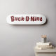 Buck-O-Nine logo in red with white outline on natural maple color skateboard deck.