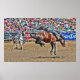 A cowboy does his best to stay on a bucking bronco at a rodeo.