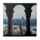 Panorama of Budapest and hungarian parliament gothic building through the arch of fisherman's bastion on Buda side - Hungary
