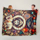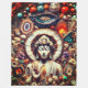 A Buddha statue in a meditative or blessing pose, surrounded by a stunning arrangement of colorful gemstones, minerals, and geodes. The background is filled with various types of stones, including agates and geodes, creating a vibrant and detailed mosaic. The natural elements and artistic arrangement make the image visually striking and interesting.