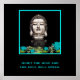 A silver Buddha head statue reflecting on black water filled with floating turquoise lotus flowers and green lily pads. Surrounded by a blue turquoise border and a black background. Inspirational quote below the image reads "Quiet the mind and the soul will speak."