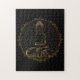 Buddha Mandala Design featuring an illustration of a buddha in shape of a mandala in golden sparkly lines.