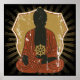 Buddha silhouette sits cross legged in dark orange robe meditating with the Dharma Wheel on his palm! Half tone background shield background creates a powerful yet peaceful Buddha gift!