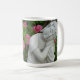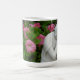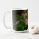 Mug with image of relaxed Buddha nestled in greenery and pink flowers.