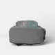 On this stylish backpack is a backdrop of chipped grey and blueish paint on rustic wood then decorative black floral wreath with a Buddha in the center and on the front pocket is the word OM creating zen like vibes