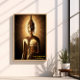 A majestic golden Buddha stands peacefully, cradling a white lotus flower in one hand. Radiating a warm light, the figure is set against a glowing halo, symbolizing enlightenment and spiritual serenity in a tranquil atmosphere.