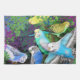 Original fine art design of colorful budgerigars or budgies by artist/designer Carolyn McFann of Two Purring Cats Studio printed on a quality, machine-washable American Mojo kitchen towel for parrot lovers.