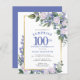 Honor a special woman with this elegant and feminine Budget 100th Birthday Surprise Party invitation. Surprise and 100th are written in large blue text. Birthday Celebration follows. The honored guest's name is also in blue capital letters. The birthday celebration details are surrounded by a chic gold frame. The blue flowers and white roses are nestled in deep green leaves.