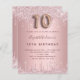 A modern, stylish and glamorous invitation for a girl's 10th birthday party. A dusty rose, pink faux metallic looking background with faux glitter drip, paint dripping look. The name is written with a modern dark rose gold colored hand lettered style script. Personalize and add your party details. Number 10 is written with a balloon style font, script.