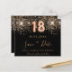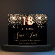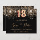 A girly and trendy Save the Date for a 18th birthday party. A black background decorated with faux gold glitter. Templates for a date and name and text. Golden colored letters. The text: Save the Date is written with a large trendy hand lettered style script.