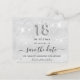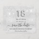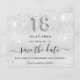 A girly and trendy Save the Date card for a 18th birthday party. A modern faux silver metallic looking background decorated with faux glitter dust. Personalize and add a date and name/age. Gray colored letters. The text: Save the Date is written with a large trendy hand lettered style script. Number 18 with a balloon style font.
