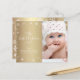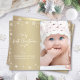 “My First Christmas.” A playful visual of white snowflakes and handwritten script typography, overlaying a brushed faux gold metallic panel and the photo of your choice, help you usher in Christmas and New Year. On the back, additional white snowflakes overlay a brushed gold metallic background. Feel the warmth and joy of the holiday season whenever you send this stylish and modern personalized budget baby photo greeting card. Perfect for the newly proud parents to send to someone special!