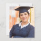 This trendy 2024 graduation party invitation features a watercolor image of an agate geode in shades of blue with faux gold highlights, along with a gold faux foil graduation cap and tassel. The word "Graduation" and the graduate's first name appear in elegant gold-colored handwriting script on an off-black background, along with party details in sans serif and italic fonts. Easily replace the sample image on the back with a vertical photo of the graduate.