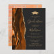 This trendy 2025 graduation party invitation features a watercolor image of burnt orange and rust agate geode with faux gold glitter highlights. The word "Graduation" and the graduate's first name appear in elegant gold-colored handwriting script on an off-black background, along along with a gold-colored mortar board cap and party details in sans serif and italic fonts. Easily replace the sample image on the back with a vertical photo of the graduate.