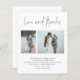 A value for money BUDGET alternative on a smaller size 4.5 x 5.6” semi-gloss 110lbs weight, which is of similar thickness to a postcard (however is not suitable to use as a postcard.). PLEASE NOTE there is ONE per sheet. Budget 2 Photo Love and Thanks Wedding Thank You. Informal minimalist style. Simply replace the two sample photos with your own favorites. Love and Thanks is in an elegant handwriting style set script, and easily personalise the rest of the text.