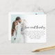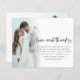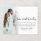 Budget 2 Photo Script Wedding Love Thanks. A budget friendly SMALLER 4.5” x 5.6” alternative. Available in a SEMI GLOSS 110 lb CARD STOCK or a SATIN FINISH 80 lb THINNER PAPER STOCK. Love and thanks is in a set handwritten style. Easily personalize the rest of the text to your own details and replace the sample photos on the front and back with your own. Add your QR code to your wedding photo online gallery on the back by replacing the QR code on the sample. You can create QR codes for free online, search 'QR code generator'.
